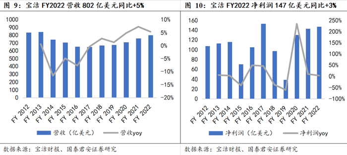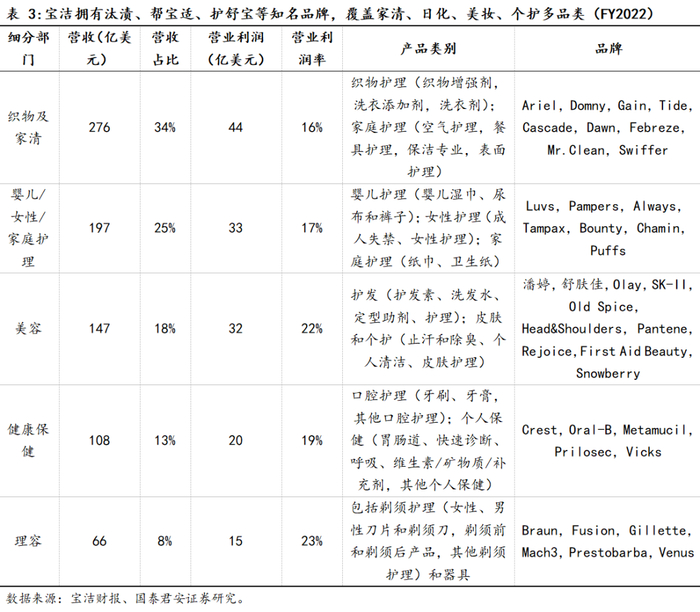 当下需关注国货品牌矩阵建设,宝洁为全球日化多品牌集团范本。多品牌建设对于美妆集团长期稳健增长具备必要性,当下多家上市公司子品牌培育迎来突破,本土美妆公司集团化逻辑有望逐步清晰。“百年老店”宝洁公司为全球日化龙头企业,FY2022营收、净利润802亿、147亿美元,拥有织物家清、婴儿&女性&家庭护理、美容、健康保健、理容五大部门,旗下包含汰渍、帮宝适、护舒宝、海飞丝、OLAY等多10亿美金以上的知名品牌。