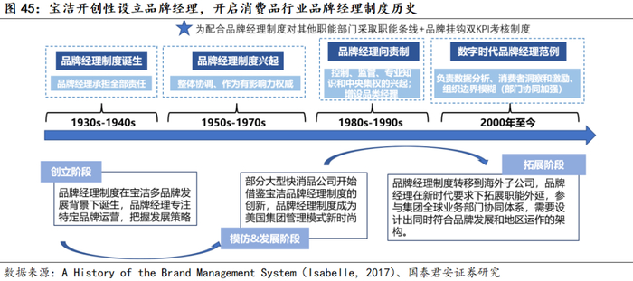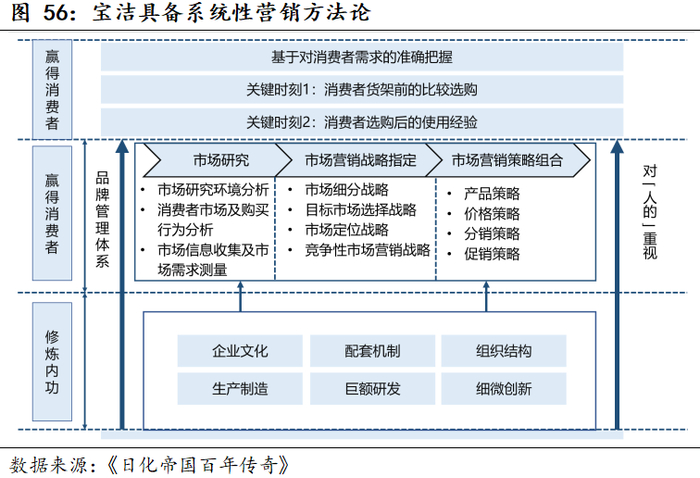 2)管理:如何将单品牌的经验复制到多个品牌中?具体需要着力的包括:组织架构设置,人才培育以及单品牌能力的复用。宝洁围绕市场部的品牌经理制度以及成熟的人才培养体系是其扩大管理半径的基础,组织架构助力调配人力资源,随着战略的扩张和收缩较为同步放权和集中,利于平衡对外和对内效率。能力建设上,宝洁崛起于渠道、媒介较为中心化的时代,多年发展锤炼了品牌化阶段扎实的能力要素:渠道不断加强对于终端的把控下规模效应明显,营销端形成系统化的品牌建设、中心化媒介助力推广资源垄断,研发端以洞察为核心提高创新效率,此外生产端降本从供给端助力竞争优势形成。