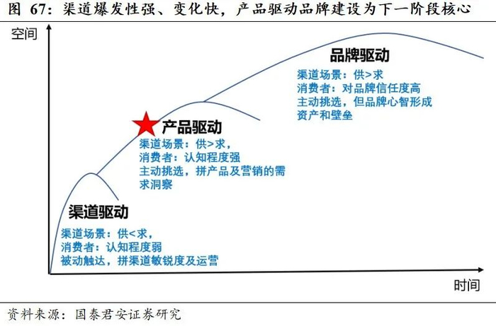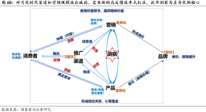 信息碎片化、产品功效为王的时代呼吁新的触达及渗透打法。宝洁系品牌核心理念是“大渗透”,即以持续提升渗透率(拉新)为品牌增长的第一要素,因为消费者是不忠诚的、对品牌差异度不敏感的、存在“双重危机定律”——顾客越少忠诚度越低。在过去的中心化渠道/媒介、规模化品牌时代所向披靡,但渠道/媒介去中心化、产品差异化逐步显露的时代,品牌进行“大渗透”的方式路径有所变化:1)渠道方面:线下相对壁垒更深,线上移动货架难以构成渠道触达的壁垒,但各家运营、数据反馈能力确有差距,需要通过放权和团队建设提高运营效率;2)媒介方面:需要搭建好KOL传播矩阵、进行信息的深度分销;3)产品洞察取代规模本身成为正反馈的来源:过去渠道媒介集中度高,规模化品牌在渠道和媒介的边际效率更高,但在碎片化营销及媒介造就产品差异化的时代,消费者对产品认知度更高、后续产品体验的反馈和传播更容易,KOL等信息分发主体也需通过科学说理来形成其赖以生存的内容、驱动消费者购买,我们认为当下更需将洞察(产品卖点及内容传达)提为竞争要素之首,以产品驱动渠道和营销。
