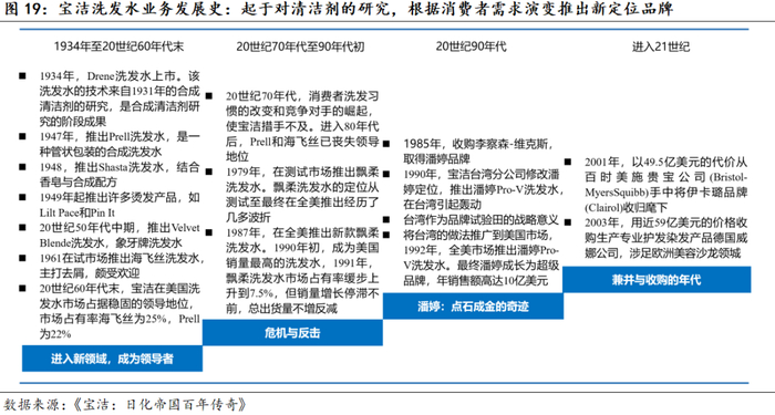 宝洁以研发创新为基、结合市场需求进行品类和品牌扩张;一品多牌,根据功效形成品牌梯队。宝洁在日化领域的极深的基础研究积淀助力其品类能力圈的扩大,在品类拓展时以研发创新为主、并结合市场需求,如开发洗衣粉汰渍时对化学清洁剂的研究使得宝洁推出洗发水和牙膏品牌、推出帮宝适纸尿裤基于对纸制品制造工艺的内化和改良。同一品类之下宝洁按功效推出细分定位品牌、并注重坚守品牌定位,以此避免定位重合造成的内耗,便于增加其货架覆盖率,如洗发水品类飘柔“柔顺”、海飞丝“去屑”、潘婷“滋养修护”、沙宣“专业造型”。全球布局的业务使其多品牌矩阵发挥到最大价值,可以根据不同市场的需求较为灵活的调度品牌进行推广。
