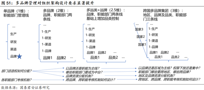 多品牌战略对管理能力的要求大幅提升,体现在机制和人才两方面。1)机制/架构方面:由于多品牌存在职能、品牌两条业务线(跨国公司还包括地区作为第三条线),需要解决各品牌、各职能之间的关系,以及职能-品牌交叉时的权责归属,并设置对应的汇报流程和考核KPI机制保障执行度;宝洁以品牌经理制为核心、各品牌相对独立利于各自发展,市场营销部门话语权较重,在考核体系上,对于各职能部门采取品牌-职能双向考核,利于其他职能部门配合品牌战略。2)人才方面:单品牌主要依靠负责人的个人能力,多品牌对于各岗位人才的需求量成倍增长;宝洁形成了系统化、标准化的培养体系,从校招开始批量培养内部人才,对公司更了解、忠诚度更高。