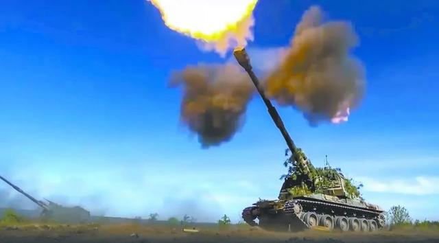 俄国防部5日通报称,挫败了乌方4日发动的大规模进攻。图为俄方5日发布的视频截图,一辆俄自行火炮正向乌军阵地开火。(视觉中国)