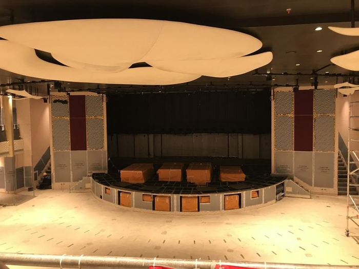 船上的儿童娱乐区、KTV区、大剧院也已初见雏形。其中大剧院可以容纳800多人,目前顶部的装修已全部完工,观众席则仍在布置中。