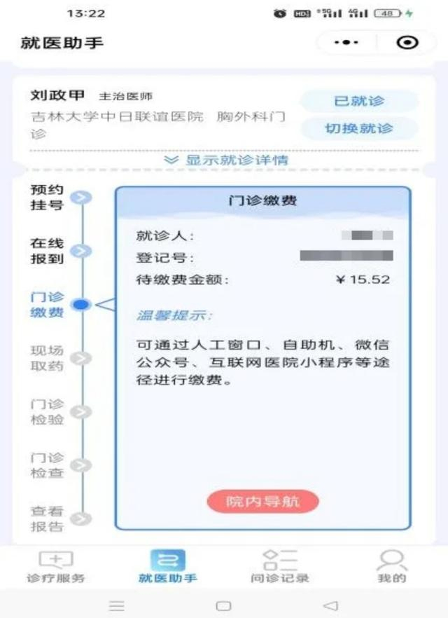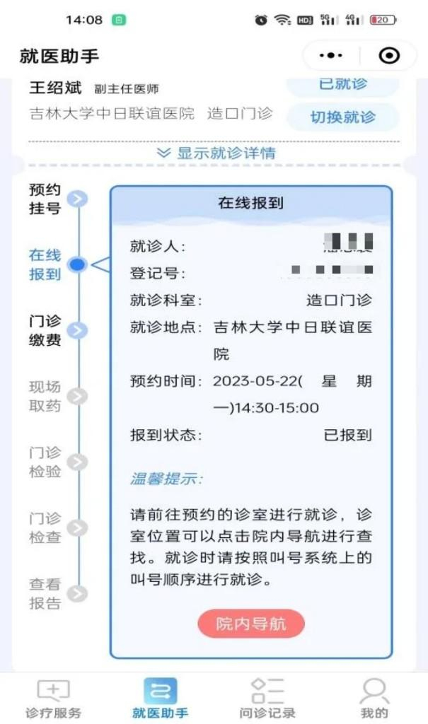 如果是线上预约挂号的患者,需要在就诊当日到院内报到,可在就医助手的“在线报到”界面进行报到。患者可以点击院内导航到达预约诊室候诊,等待叫号系统叫号,进行就诊。
