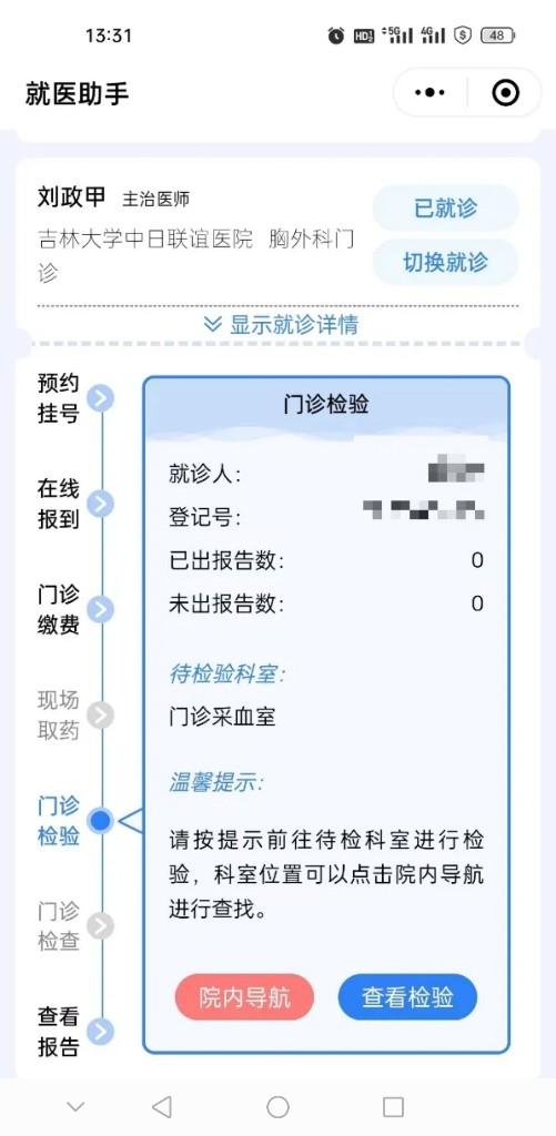 缴费后,就医助手会显示患者检验科室,患者可以通过院内导航到达检验地点,也可以在门诊检验界面查看检验明细。