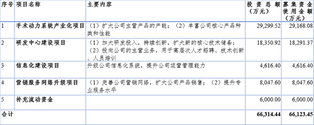 通过本次科创板IPO,公司拟募集资金6.61亿元,将投入微创手术器械科技创新领域。其中,手术动力系统产业化项目将充分利用公司自主研发和“产、学、研、医”合作模式下形成的核心技术,扩大公司产能,同时通过生产线自动化升级提升生产效率和产品质量,提升市场竞争力。研发中心建设项目将改善研发工作环境、引进高端研发人才、配置先进研发设备,进一步扩展手术动力装置应用科室,开发内窥镜系统及能量手术设备等新产品,推动公司向微创手术工具整体方案提供者的战略定位发展。