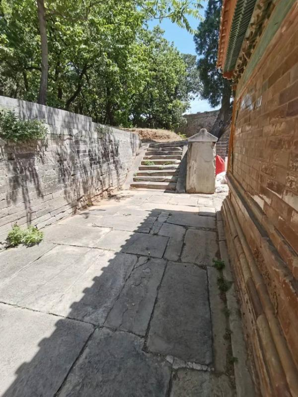 攀上方城后望,又发现茂陵的第二个看点。宝山正面便是琉璃影壁,多数帝陵的琉璃影壁都是紧贴着甚至嵌入宝山的封土墙,上宝山需要从方城一侧沿台阶走到宝山顶部。而茂陵的琉璃影壁距离宝山的封土墙还有两米多的宽度,影壁后的左右两侧设立了踏跺式台阶,人们可以从这里直接步上宝城顶部,这是十三陵中独有的建筑结构。