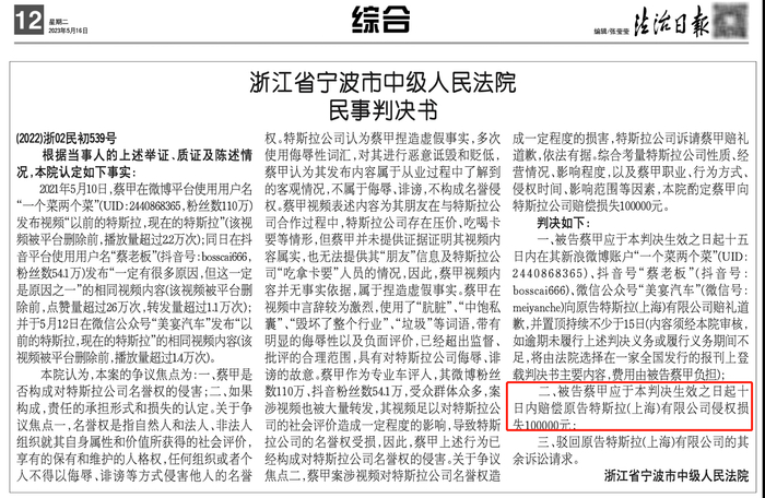 特斯拉认为名誉权被侵害,将“蔡老板”告上法庭。2022年,法院判决结果公布,法院认定“蔡老板”视频内容并无事实依据,属于捏造虚假事实。“蔡老板”应在其微博、抖音、微信公众号向原告特斯拉赔礼道歉,并置顶持续不少于15日,并在判决生效之日起十日内赔偿特斯拉(上海)有限公司侵权损失10万元。