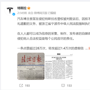 6月6日,特斯拉在官方微博发文称,全网粉丝近700万的汽车博主蔡某在侵犯特斯拉名誉权被判败诉后,因拒不履行在相关网络平台公开赔礼道歉的义务,被浙江省宁波市中级人民法院强制执行。