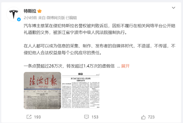 6月6日,特斯拉在微博发文称,汽车博主蔡某在侵犯特斯拉名誉权被判败诉后,因拒不履行在相关网络平台公开赔礼道歉的义务,被浙江省宁波市中级人民法院强制执行。