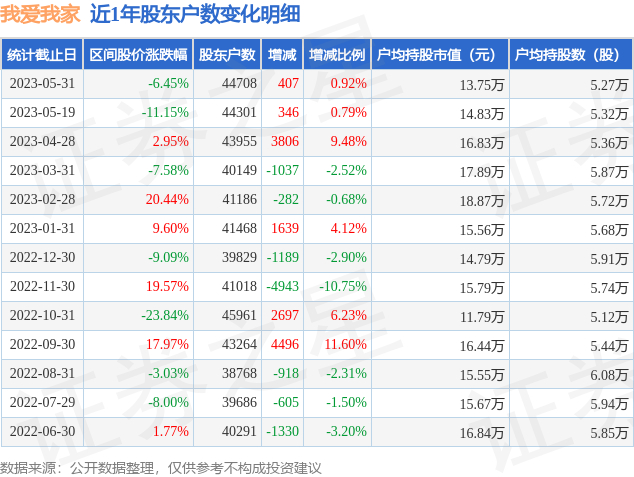 从股价来看,2023年5月19日至2023年5月31日,我爱我家区间跌幅为6.45%,在此期间股东户数增加407.0户,增幅为0.92%。