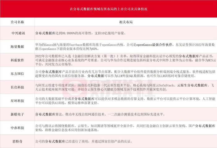 据财联社不完全统计,涉及分布式数据库的A股上市公司包括中兴通讯、海量数据、科蓝软件、东方国信、长亮科技、星环科技、新联电子、中亦科技和思特奇等,具体如下: