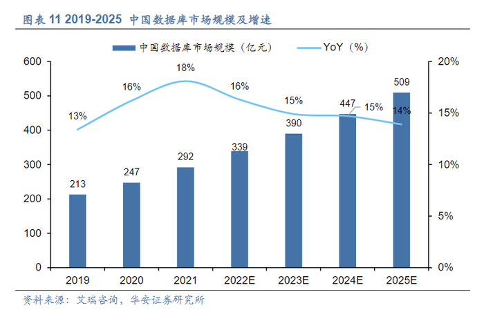 根据艾瑞咨询数据,我国数据库市场将于2025年达509亿元,同比增速约14%。