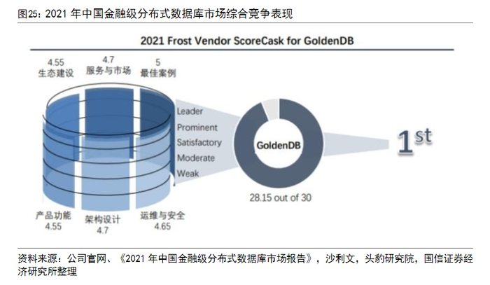 竞争格局方面,国信证券马成龙等人3月10日研报指出,根据沙利文联合头豹研究院发布的《2021年中国金融级分布式数据库市场报告》,中兴通讯旗下金篆信科GoldenDB以总分28.15的优异成绩位居中国金融级分布式数据库第一位置,这是GoldenDB继获得2020年中国金融级分布式数据库第一之后再获殊荣,蝉联国产分布式数据库金融行业第一位置。
