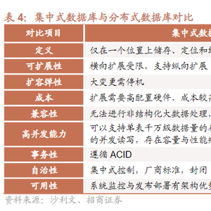 云计算场景推动分布式数据库发展。招商证券认为,分布式数据库通过资源池化管理实现物理或逻辑层的相互隔离与资源的自由伸缩,具备弹性扩张、HTAP事务能力、多租户管理能力、高可用性,与云计算场景需求相匹配。