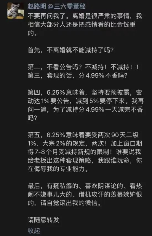 三六零董秘赵路明曾在朋友圈发文表示,“离婚是很严肃的事情,我相信大部分人还是把感情看的比金钱重的。”
