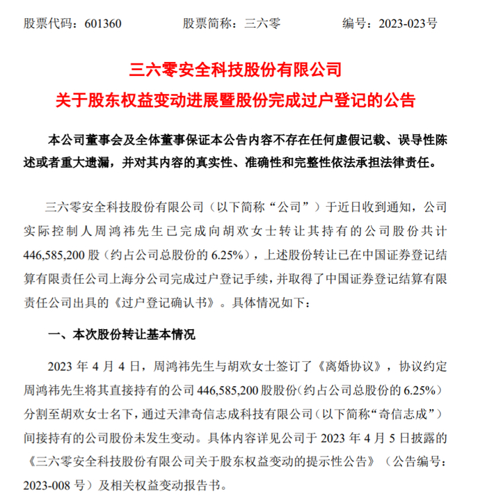 今年4月4日晚间,三六零发布公告称,公司获悉2023年4月4日周鸿祎先生与胡欢女士经友好协商,已办理解除婚姻关系手续,并就股份分割等事宜作出相关安排。根据周鸿祎先生与胡欢女士签订的《离婚协议书》,周鸿祎先生拟将其直接持有的公司446,585,200股股份(约占公司总股份的6.25%)分割至胡欢女士名下。本次权益变动不会导致公司控股股东、实际控制人发生变化,不涉及公司控制权变更。