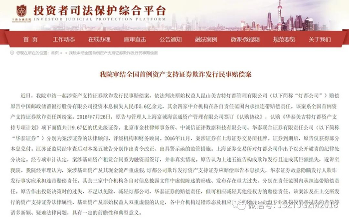 上海金融法院公布,近日,我院审结一起涉资产支持证券欺诈发行民事赔偿案,依法判决原始权益人昆山美吉特灯都管理有限公司(以下简称“灯都公司”)赔偿原告中国邮政储蓄银行股份有限公司投资本息损失人民币5.6亿元,其余四家中介机构在各自责任范围内承担连带赔偿责任。