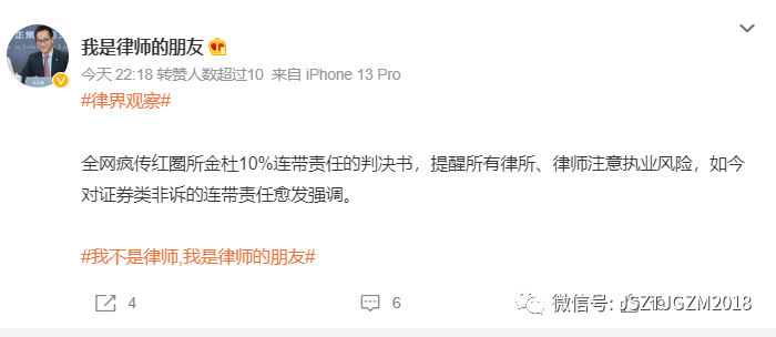 知名法律博主感慨,“全网疯传红圈所金杜10%连带责任的判决书,提醒所有律所、律师注意执业风险,如今对证券类非诉的连带责任愈发强调。”