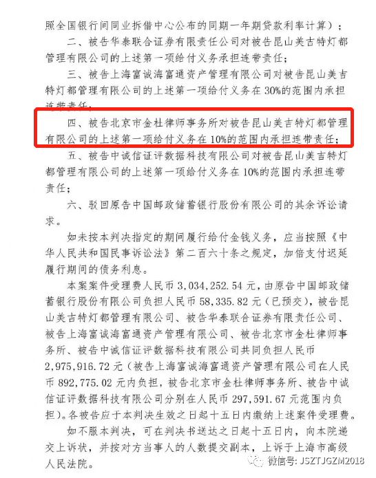 审理结果显示,灯都公司属于欺诈发行资产支持证券应赔偿原告本息损失,而财务顾问应承担连带赔偿责任,是哪家中介则对信息披露虚假陈述的形成、发布有重大过失。最终,金杜律所要在10%责任范围内承担连带责任。5.6亿的10%大约就是赔偿5600万。