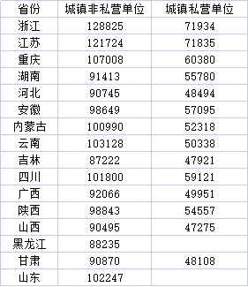 数据显示,16个省份中,有7个省份城镇非私营单位就业人员平均工资超过了10万元,其中浙江和江苏超过了12万元。