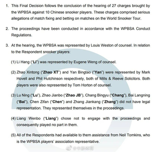 可以说,这次的假球案影响恶劣,调查取证耗时费力。从4月下旬开始的听证会持续接近两周之久,经过长时间的调查、听证,才在一个多月之后做出了上述处罚。中国台球协会的处罚也将很快出台。当然,世界职业比利和斯诺克协会同时也表示,被处罚球员拥有上诉的权利。