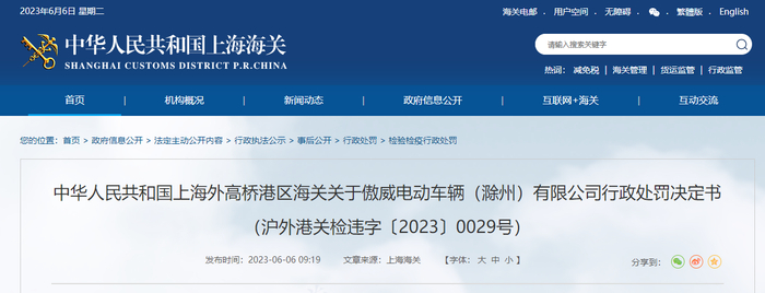 关于傲威电动车辆(滁州)有限公司行政处罚决定书(沪外港关检违字〔2023〕0029号)