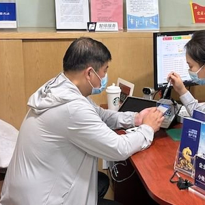 图说:尹先生在交行工作人员指导下,登录小程序办理企业银行账户开户 金旻矣 摄
