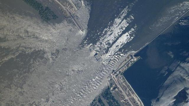 当地时间2023年6月6日,赫尔松地区,卫星图像显示卡霍夫卡大坝的损坏情况。视觉中国 图