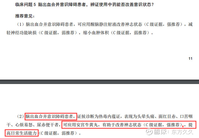 同时,新版指南更加强调中医药的诊治经验及数据,进一步明确了中医药在脑卒中防治中的重要地位和作用。在“新版指南”中,安宫牛黄丸被推荐用于脑出血急性期者、脑出血急性期合并高血压患者、脑出血合并意识障碍患者和急性脑梗死痰热证患者的治疗。