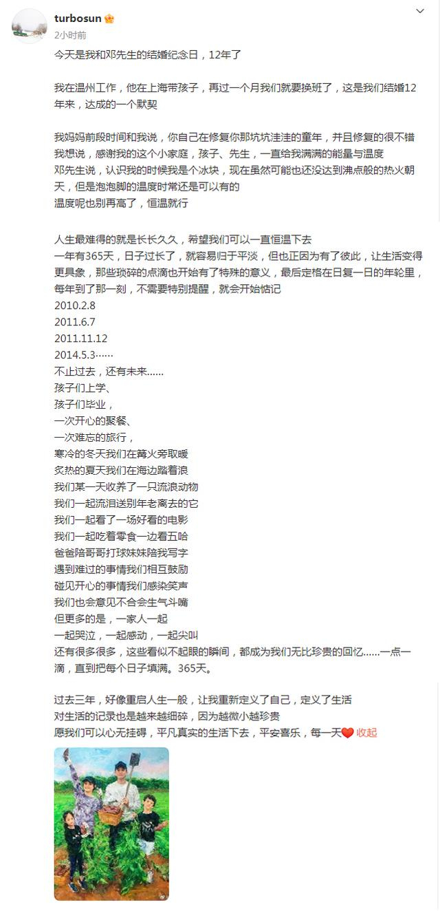 今(7)日,演员孙俪发长文庆祝和邓超结婚12周年纪念日,她分享了这些年一家四口的点点滴滴,字里行间情真意切。她还晒出一张油画全家福,一家四口在地里挖红薯,场景温馨。