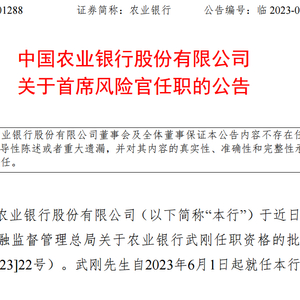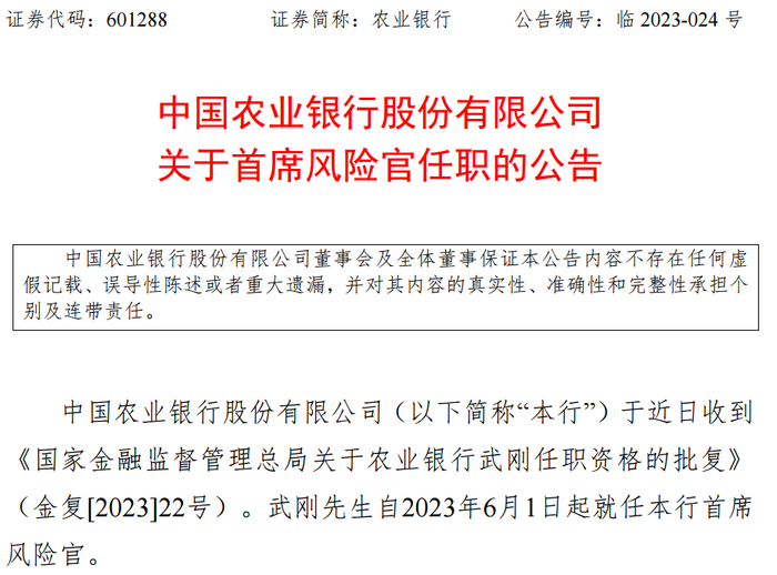 6月6日,农业银行(601288.SH)公告称,该行近日收到《国家金融监督管理总局关于农业银行武刚任职资格的批复》。武刚自2023年6月1日起就任该行首席风险官。