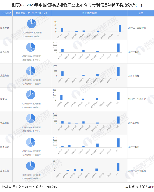 从植物提取物行业中游的上市企业已有的公开信息分析,专利信息相对较多的企业是晨光生物,其中发明专利426条;员工总数最多的则是康恩贝,员工总数为8589人;技术人员相对最多的同样是康恩贝,技术人员总数为2215人。
