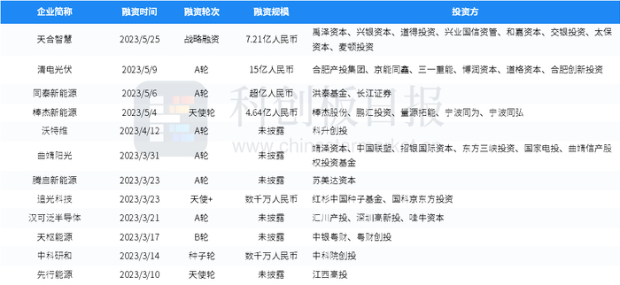 据创投通数据,近一年来,国内有54家光伏产业企业获得投资,部分案例如下表所示: