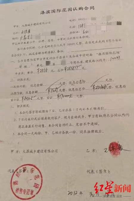 王伟康是大荔县高明镇人,他和妻子早年一直在南方打工挣钱,经过多年奋斗两人攒下一笔积蓄。2012年时夫妻俩支付了8万多元的首付,在县城洛滨国际花园小区贷款购入一套100平方米左右的房子。合同显示开发商为大荔城乡建设有限公司,当时的房价是每平方米2578元,总价值约25万多元。由于购买的是期房,王伟康第一时间并没有拿到房产证。
