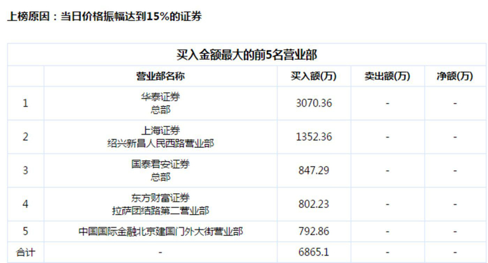 当日(6月6日)盘后交易信息显示,买入金额最大的前五名营业部分别为华泰证券总部、上海证券绍兴新昌人民西路营业部、国泰君安证券总部、东方财富证券拉萨团结路第二营业部、中国国际金融北京建国门外大街营业部,合计买入金额为6865.1万元。