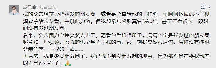 后来,父亲因为心梗突然去世了,翻看他手机相册里,满满的全是我发过的朋友圈照片和一些视频,收藏的也全是关于我的事,那一刻我突然很后悔,后悔没有多跟父亲分享一下我的生活……