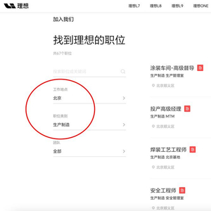 官网招聘信息显示,理想汽车在北京地区生产制造方面共67个职位在招,工作地点为北京顺义区。岗位包括涂装车间-高级督导、投产高级经理、焊装工艺工程师、安全工程师、在线检验班组长等等。