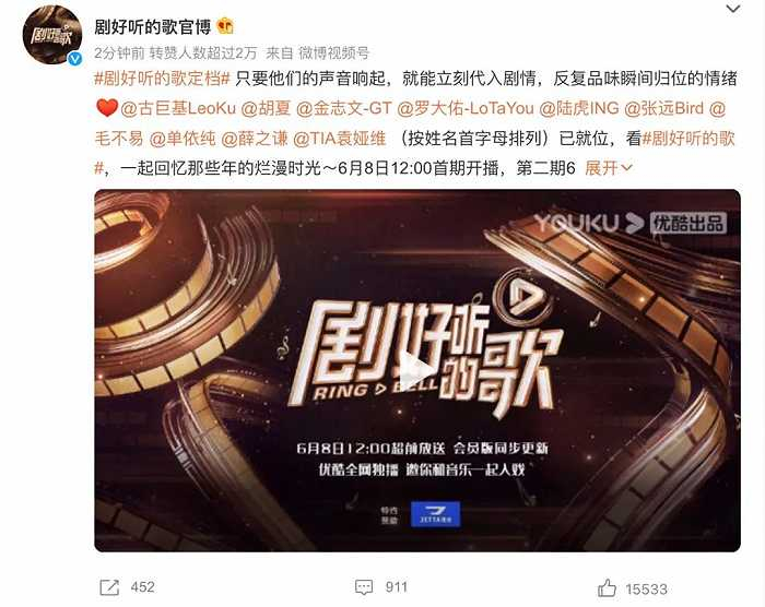 后者是内娱首档OST音综,影视剧歌曲这个双IP叠buff的玩法还蛮新鲜。该项目无疑是优酷年中力推的重磅S+(定档了6月8日),卡司能码到罗大佑、古巨基、薛之谦、毛不易,算是音综里很有想法也很豪华的一个选角。