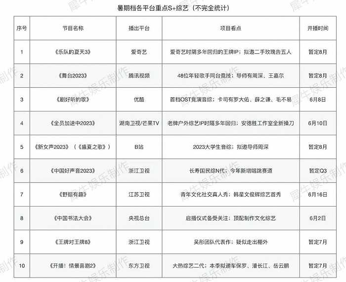 这个暑期档,除了是平台的注意力之争,也是明星级综艺制作公司的开发力之争。全盘梳理下来,犀牛君发现,这些明星制作人将在今夏推出近11部综艺新作。(见下表)