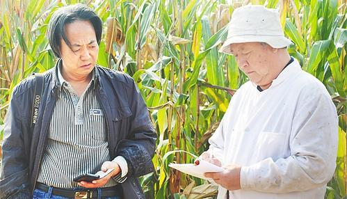 公司领导在玉米示范田查看品种的田间表现情况。