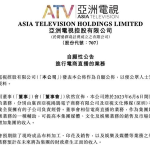 6月6日,港股上市公司亚洲电视控股有限公司(0707.HK)发布公告称,公司将于2023年6月6日开始进入电商直播的业务,分别由广西亚视鸿鹄电子商务有限公司及亚视文化传媒(深圳)有限公司两家间接全资拥有的子公司负责经营。