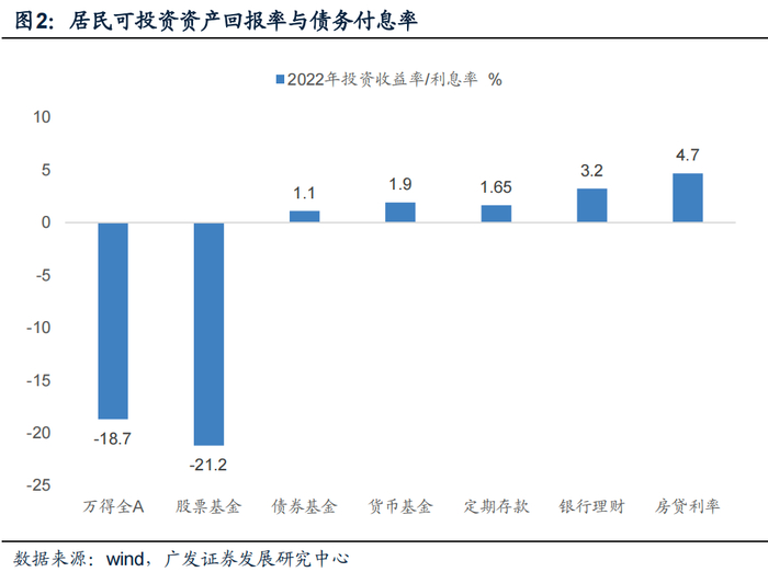 居民可以投资的金融资产包括股票、股票基金、债券基金、货币基金、银行理财与银行存款六个大类,这六个大类在2022年的投资回报率,我们分别以万得全A涨幅、中证股票基金指数涨幅、中证债券基金指数涨幅、中证货币基金指数涨幅、6个月银行理财产品预期收益率(年初)、工商银行1年期定期存款挂牌利率为代理变量。这里面表现最好的是银行理财,为3.24%,其余资产投资回报率都比较一般。