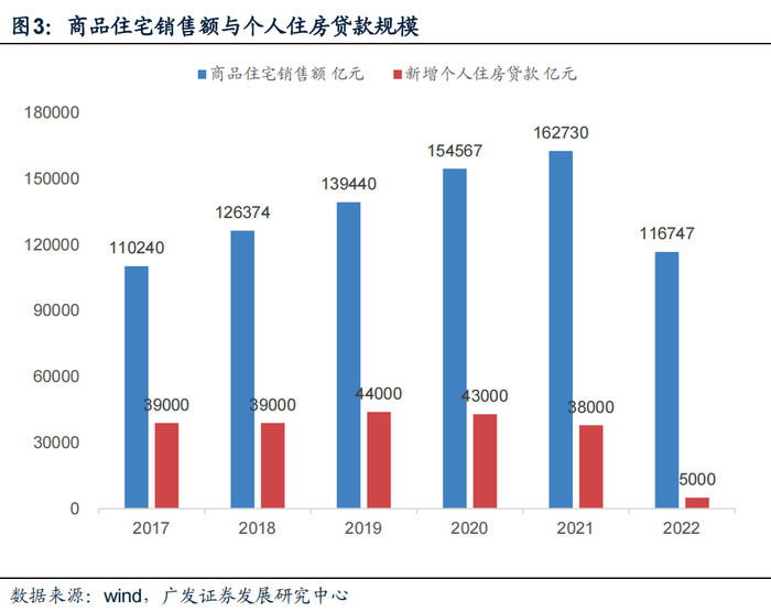 在2022年,商品住宅销售总额大约是11.6万亿元,新增个人住房贷款增量为4800亿元;上一次商品住宅销售总额处于11-12万亿元这一量级是在2017年,当年新增个人住房贷款增量为2.76万亿元。