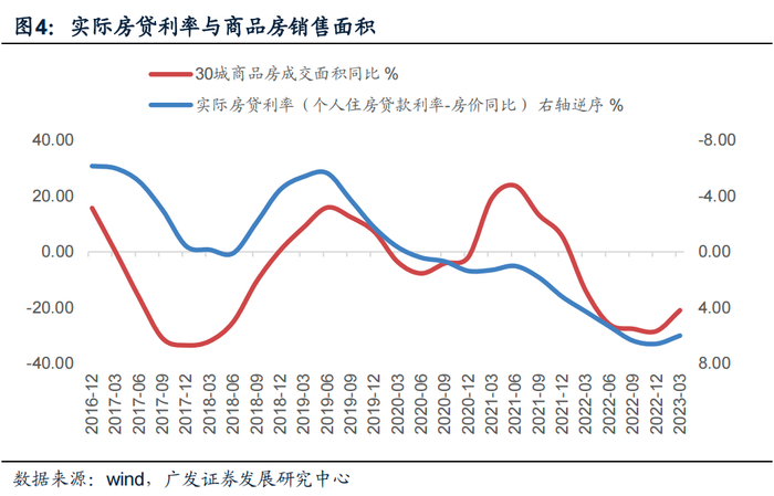 逻辑上的推论就是,后续LPR尤其是5年期LPR报价是否会跟进下调,以进一步降低房贷利率,稳定居民部门的预期将是一个关键。这也是LPR机制的灵活性所在。今年房地产价格处于同比负增长的周期区间,我们以70个大中城市新建住宅价格同比作为房价的代理变量,实际房贷利率(个人住房贷款利率-房价同比)与30城商品房成交面积有极好的负相关性,而它在今年一季度末仍处于6%附近的经验高位。基于稳定地产市场预期,支持刚性和改善性需求的目标,名义房贷利率与价格周期同步调整具备政策合理性。