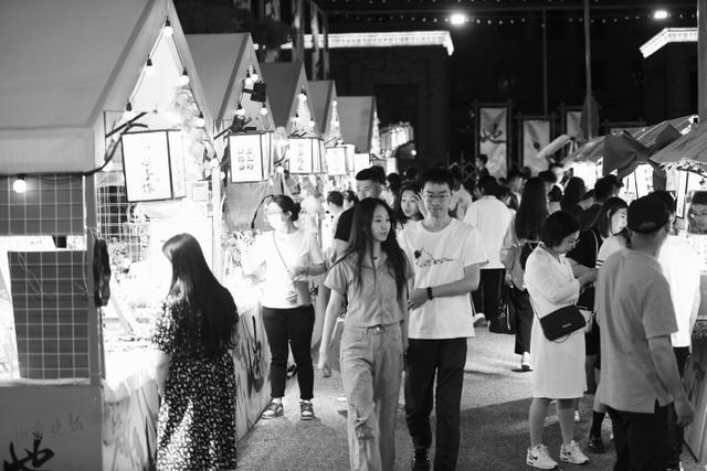 走在钟楼步行街,优衣库、万斯、耐克、MLB……国内外的潮牌与快时尚品牌在这里汇聚;盛江山、秦门小馆……天南海北的美味在这里碰撞。古建林立的街道上,你随时可以有前卫有趣的购物体验。在防晒品牌蕉下的自动售卖机前,一位长发姑娘正点击操作屏,自助购买一顶防晒帽,从出货口拿出货品拆开包装戴在头上,全程不过1分钟;在“也市”的手工饰品摊前,大蒜、核桃、红枣、鲜花等被经过特殊加工做成发卡、耳环、戒指,引来爱美姑娘们的围观选购,老板更是风趣地表示这些产品是“自作自售”;在棉花糖自动制作机前,两个小朋友正瞪大双眼,仔细地看着透明密封箱内的机器旋转制作巨大“奶瓶”棉花糖,当取出“奶瓶”的那一刻,孩子和家长同时开怀大笑……一幕幕生动的消费场景如流动的光影,展现着龙城升腾不息的烟火气。