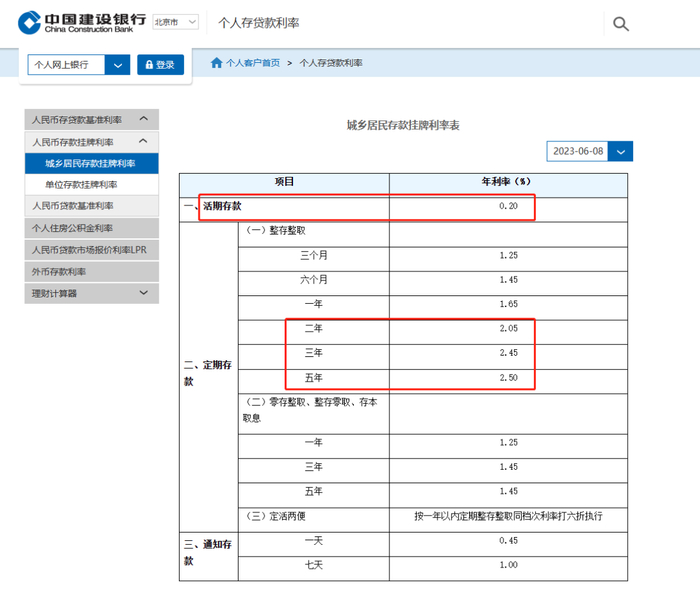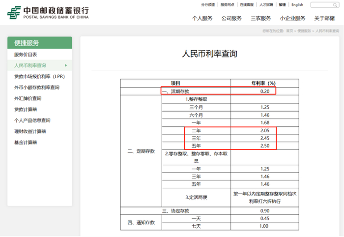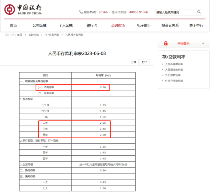 其中,活期存款利率从此前的0.25%下调至0.2%。2年期定期存款利率下调10个基点至2.05%,3年期定期存款利率下调15个基点至2.45%,5年定期存款利率下调15个基点至2.5%。