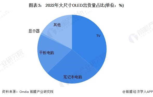 从大尺寸OLED下游应用来看,TV是大尺寸OLED的主要应用市场,占比约36%。由于三星与LG的进入,显示器OLED市场增长迅速,2022年显示器OLED的出货量同比增加了1151%。从企业层面看,三星、LG等企业在大尺寸AMOLED面板领域处于绝对优势地位。