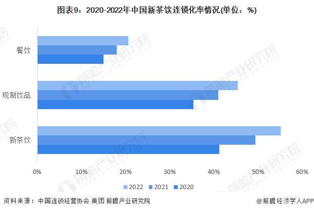 新茶饮具有一定零售产业特性,标准化程度高,开店门槛低,拓店成本低,能够迅速实现复制,同时行业优胜劣汰竞争效应也被进一步放大。美团数据显示,2020-2022年餐饮业连锁化率从15%提升到20.7%。同期,新茶饮的连锁化率从41.2%提升到55.2%。在多个城市核心商圈的抽样调查中,新茶饮的连锁化率超80%。