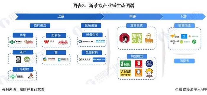 新茶饮产业链上游主要原材料及包装设备供应环节,其中原材料主要可分为茶、水果、奶制品、糖、口感颗粒等;中游环节主要分为直营和加盟两种模式;下游环节为流通环节,分为线下和线上外两种渠道。